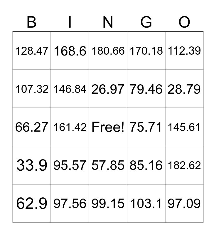 This bingo card has a free space and 24 words: 95.57, 97.56, 26.97, 62.9, 112.39, 128.47, 107.32, 168.6, 75.71, 57.85, 79.46, 66.27, 85.16, 182.62, 146.84, 103.1, 145.61, 180.66, 28.79, 161.42, 97.09, 33.9, 170.18 and 99.15.
