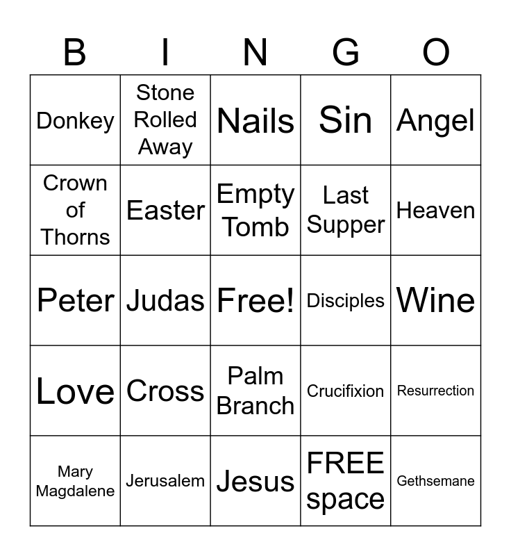 This bingo card has a free space and 25 words: Cross, Jesus, Empty Tomb, Mary Magdalene, Angel, Donkey, Crown of Thorns, Stone Rolled Away, Disciples, Palm Branch, Last Supper, Peter, Crucifixion, Resurrection, Easter, Bread, Wine, Nails, Heaven, Judas, Gethsemane, Jerusalem, Love, Sin and FREE space.