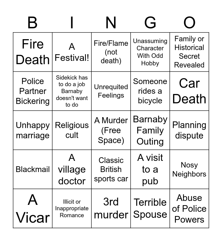 This bingo card has a free space and 59 words: 2 Murders, Illicit or Inappropriate Romance, A Feud, Blackmail, Terrible Spouse, Seargent Says Wrong or Inappropriate Thing, Sidekick has to do a job Barnaby doesn't want to do, Character returns after a long time, Someone rides a bicycle, Police Arrive Just in Time, Unassuming Character With Odd Hobby, Side Plot of No Consequence, Police Partner Bickering, Tea, Alcohol, Fire Death, Abuse of Police Powers, Family or Historical Secret Revealed, Quaint Village Life, Unrequited Feelings, Barnaby Family Outing, Fire/Flame (not death), A Vicar, Nosy Neighbors, Shooting, Sports, Nicely Staged Murder, Blackmail, Car Death, Religious Nut, Drowning, Activist, Smothering, Name of the village pub reflects the theme of the episode, A Festival!, Barnaby asks someone 'When did you last see the victim alive', Paternity secret revealed, Religious cult, Single interest village, Unhappy marriage, Mrs. Barnaby has a new hobby, A village doctor, Planning dispute, Sibling rivalry, Victim says "What are you doing here?" (followed by murder), Inheritance is suggested as a motive, Stately Home, Book shop, Classic British sports car, 3rd murder, Thatched cottage, Stabbing, Barnaby Family is involved with murder setting, Medical Examiner says something sassy., Former policeman investigates or is involved with murder, A visit to a pub, Victim is murdered by mistake, Canal, Waterway, or Lake and Someone lives in a caravan.