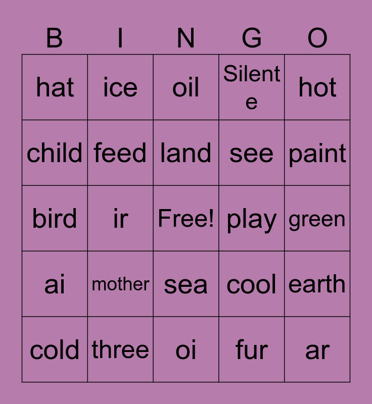 This bingo card has a free space and 24 words: mother, three, land, cold, hot, hat, child, ice, play, sea, see, bird, cool, earth, feed, fur, green, oil, paint, ir, ar, ai, Silent e and oi.