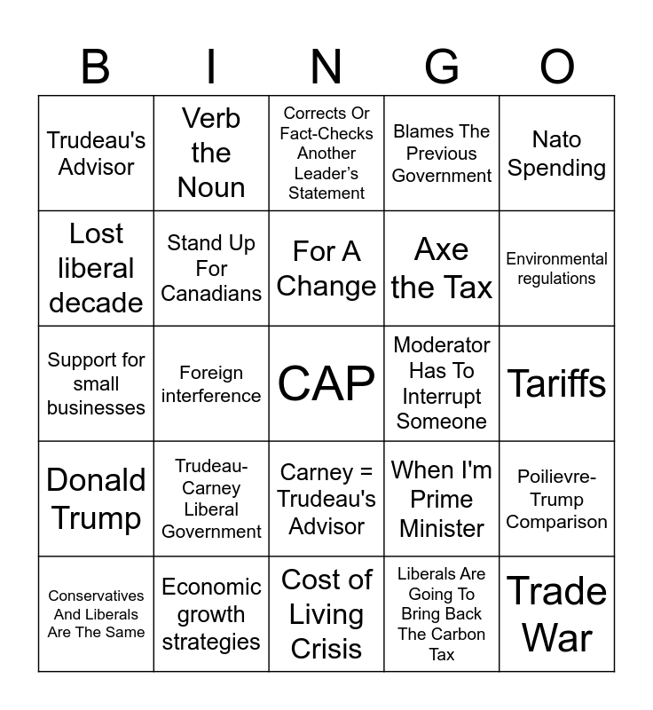 This bingo card has a free space and 113 words: 51st State, Affordable housing, America Bashing, Annexed, Appeals To Authority, Avoids Answering A Direct Question, Blames The Previous Government, Blanchet Supports Canadian Unity (Against America), Brings Up A Scandal Or Controversy From Another Party’s Past, Brookfield Questionable Practices, Building Homes, Calls For National Unity Or Working Together, Canada Is Not For Sale, Canadians Deserve Better, Carbon Tax Carney, Carbon tax repeal, Carney = Trudeau's Advisor, Carney Uses A Hockey Metaphor, Climate change, Common sense policy, Conservatives And Liberals Are The Same, Corrects Or Fact-Checks Another Leader’s Statement, Criticizes Another Party's Platform Instead Of Defending Their Own, Cutting Bureaucracy, Defense spending increase, Donald Trump, Economic growth strategies, Education reform, Elbows Up, Energy sector investments, Environmental regulations, For A Change, Foreign interference, Hardworking Canadians, (s)he expects us to believe..., Healthcare funding, Housing Crisis, Immigration policy, Indigenous reconciliation", Inflation, Infrastructure development, Interrupts Another Leader, Job creation initiatives, Just Like Justin, Keep Liberals In Check, Let Me Be Perfectly Clear, Liberals Are Going To Bring Back The Carbon Tax, Lost liberal decade, Makes A Personal Attack, Mention Of Dental / Pharma / Childcare, Middle-class, Moderator Has To Interrupt Someone, More Of The Same, more of the same, National security concerns, National unity, Not what this country needs, Our Neighbors Down South, Poilievre Called Out On Indigenous Issues, Poilievre’s Security Clearance, Poilievre-Trump Comparison, Public broadcasting (de)funding, Put Canada first, Quebec And Canada, Refers To "Hard-Working Families", Refers To "Ordinary Canadians", Someone Steals Someone Else's Time, Stand Up For Canadians, Support for small businesses, Talks Over The Moderator, Tariffs, Tax relief for Canadians, Tells The Story Of A Young Person, Thanks Or Compliments Another Leader, The best interest of Canadians, Trade War, Trudeau-Carney Liberal Government, Trudeau's Advisor, Under the previous government, Uses A Personal Story To Make A Point, Uses The Phrase “Building A Better Future”, Verb the Noun, We need to pivot, When I'm Prime Minister, Axe the Tax, Carney takes credit for NDP Programs, Carney takes credit for outcome of 2008 recession, Cayman Islands, Pipelines, Ukraine, Palestine, Rally Size, Nato Spending, China, Russia, CUSMA, Notwithstanding Clause, Mention of a Premier, Button Gate, Supply Management, Blind Trust, Asked to solve a Provincial Problem, Awkward Silence, Jobs, Out of Touch, Heated Argument, Cost of Living Crisis, Minimum Wage, Unions, Scapegoating or Tokenizing Marginalized Peoples, Transphobia Racism Ableism Sexism Homophobia, Corporate Greed and Health Care.