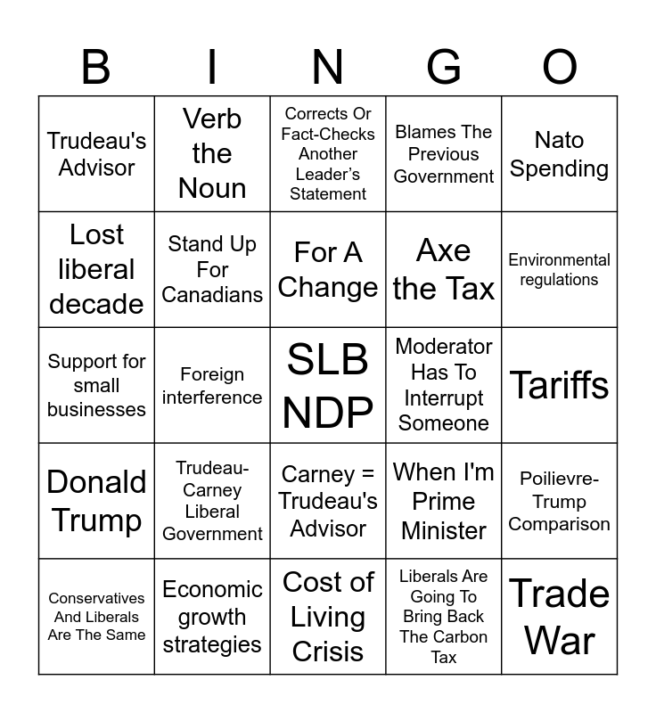 This bingo card has a free space and 113 words: 51st State, Affordable housing, America Bashing, Annexed, Appeals To Authority, Avoids Answering A Direct Question, Blames The Previous Government, Blanchet Supports Canadian Unity (Against America), Brings Up A Scandal Or Controversy From Another Party’s Past, Brookfield Questionable Practices, Building Homes, Calls For National Unity Or Working Together, Canada Is Not For Sale, Canadians Deserve Better, Carbon Tax Carney, Carbon tax repeal, Carney = Trudeau's Advisor, Carney Uses A Hockey Metaphor, Climate change, Common sense policy, Conservatives And Liberals Are The Same, Corrects Or Fact-Checks Another Leader’s Statement, Criticizes Another Party's Platform Instead Of Defending Their Own, Cutting Bureaucracy, Defense spending increase, Donald Trump, Economic growth strategies, Education reform, Elbows Up, Energy sector investments, Environmental regulations, For A Change, Foreign interference, Hardworking Canadians, (s)he expects us to believe..., Healthcare funding, Housing Crisis, Immigration policy, Indigenous reconciliation", Inflation, Infrastructure development, Interrupts Another Leader, Job creation initiatives, Just Like Justin, Keep Liberals In Check, Let Me Be Perfectly Clear, Liberals Are Going To Bring Back The Carbon Tax, Lost liberal decade, Makes A Personal Attack, Mention Of Dental / Pharma / Childcare, Middle-class tax cuts, Moderator Has To Interrupt Someone, More Of The Same, more of the same, National security concerns, National unity, Not what this country needs, Our Neighbors Down South, Poilievre Called Out On Indigenous Issues, Poilievre’s Security Clearance, Poilievre-Trump Comparison, Public broadcasting (de)funding, Put Canada first, Quebec And Canada, Refers To "Hard-Working Families", Refers To "Ordinary Canadians", Someone Steals Someone Else's Time, Stand Up For Canadians, Support for small businesses, Talks Over The Moderator, Tariffs, Tax relief for Canadians, Tells The Story Of A Young Person, Thanks Or Compliments Another Leader, The best interest of Canadians, Trade War, Trudeau-Carney Liberal Government, Trudeau's Advisor, Under the previous government, Uses A Personal Story To Make A Point, Uses The Phrase “Building A Better Future”, Verb the Noun, We need to pivot, When I'm Prime Minister, Axe the Tax, Carney takes credit for NDP Programs, Carney takes credit for outcome of 2008 recession, Cayman Islands, Pipelines, Ukraine, Palestine, Rally Size, Nato Spending, China, Russia, CUSMA, Notwithstanding Clause, Mention of a Premier, Button Gate, Supply Management, Blind Trust, Asked to solve a Provincial Problem, Awkward Silence, Jobs, Out of Touch, Heated Argument, Cost of Living Crisis, Minimum Wage, Unions, Scapegoating or Tokenizing Marginalized Peoples, Transphobia Racism Ableism Sexism Homophobia, Corporate Greed and Health Care.