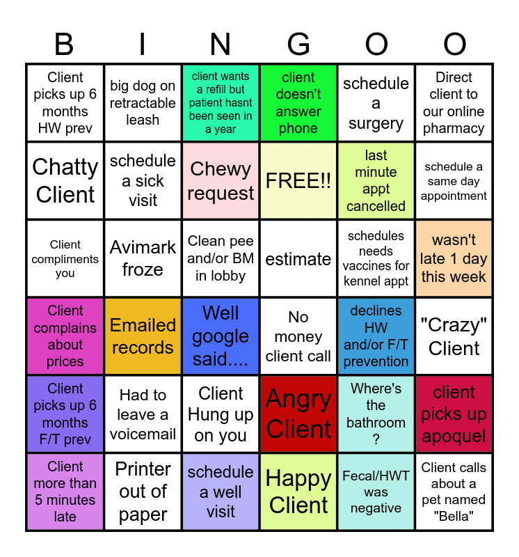 This bingo card has 36 words: Angry Client, Client Hung up on you, Happy Client, Chatty Client, Client complains about prices, estimate, schedule a sick visit, schedule a well visit, schedule a surgery, Where's the bathroom ?, schedule a same day appointment, client doesn't answer phone, client picks up apoquel, Avimark froze, FREE!!, Client picks up 6 months HW prev, Client picks up 6 months F/T prev, schedules needs vaccines for kennel appt, Client compliments you, client wants a refill but patient hasnt been seen in a year, Clean pee and/or BM in lobby, Emailed records, No money client call, Well google said...., declines HW and/or F/T prevention, big dog on retractable leash, last minute appt cancelled, Printer out of paper, Chewy request, Direct client to our online pharmacy, Client calls about a pet named "Bella", Client more than 5 minutes late, "Crazy" Client, wasn't late 1 day this week, Had to leave a voicemail and Fecal/HWT was negative.