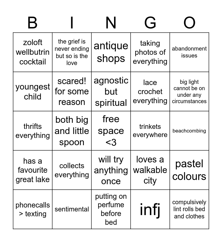 This bingo card has a free space and 24 words: collects everything, sentimental, agnostic but spiritual, phonecalls > texting, abandonment issues, zoloft wellbutrin cocktail, youngest child, the grief is never ending but so is the love, trinkets everywhere, will try anything once, lace crochet everything, thrifts everything, loves a walkable city, pastel colours, scared! for some reason, infj, beachcombing, antique shops, big light cannot be on under any circumstances, both big and little spoon, compulsively lint rolls bed and clothes, has a favourite great lake, taking photos of everything and putting on perfume before bed.