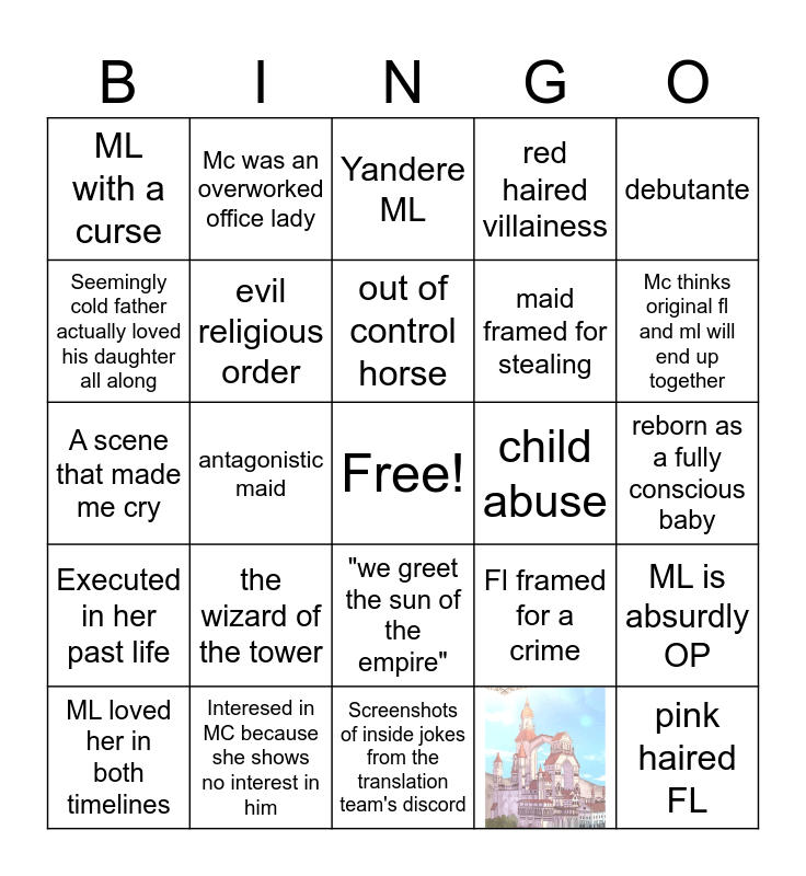 This bingo card has 2 images, a free space and 37 words: distracting CGI, being blamed for mothers death, evil religious order, ML loved her in both timelines, "we greet the sun of the empire", out of control horse, the hunting tournament, debutante, Executed in her past life, antagonistic maid, red haired villainess, pink haired FL, reborn as a fully conscious baby, child abuse, the wizard of the tower, the cold duke of the north, ML with a curse, FL steps on peoples shoes while dancing, Fl framed for a crime, Seemingly cold father actually loved his daughter all along, Screenshots of inside jokes from the translation team's discord, maid framed for stealing, Mc thinks original fl and ml will end up together, MC was a villainess in her past life, mc becomes a saintess, slaves, extended family after Mc's inheritence, contract marriage, Mc was an overworked office lady, Family member ML, Uncomfortable age gap, Yandere ML, Interesed in MC because she shows no interest in him, MC saving up money to run away, ML is absurdly OP, A scene that made me cry and Second male lead syndrome.