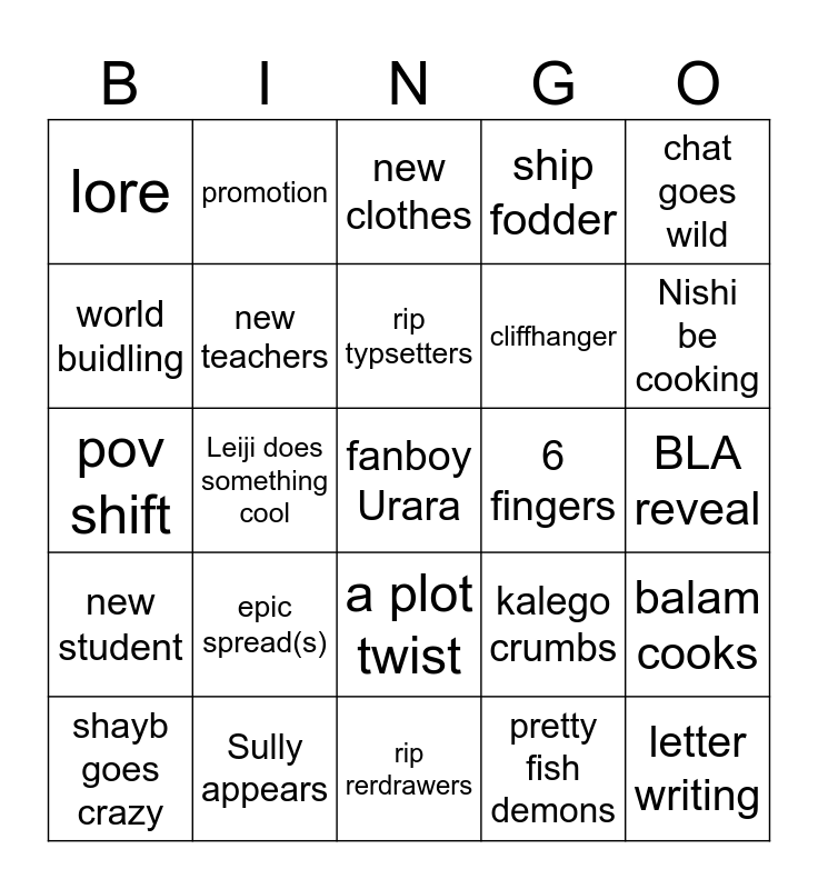 This bingo card has a free space and 25 words: epic spread(s), rip rerdrawers, rip typsetters, shayb goes crazy, chat goes wild, lore, world buidling, promotion, 6 fingers, a plot twist, cliffhanger, pov shift, kalego crumbs, balam cooks, new teachers, new magic shown, BLA reveal, new clothes, Nishi be cooking, Leiji does something cool, letter writing, Sully appears, new student, ship fodder and pretty fish demons.