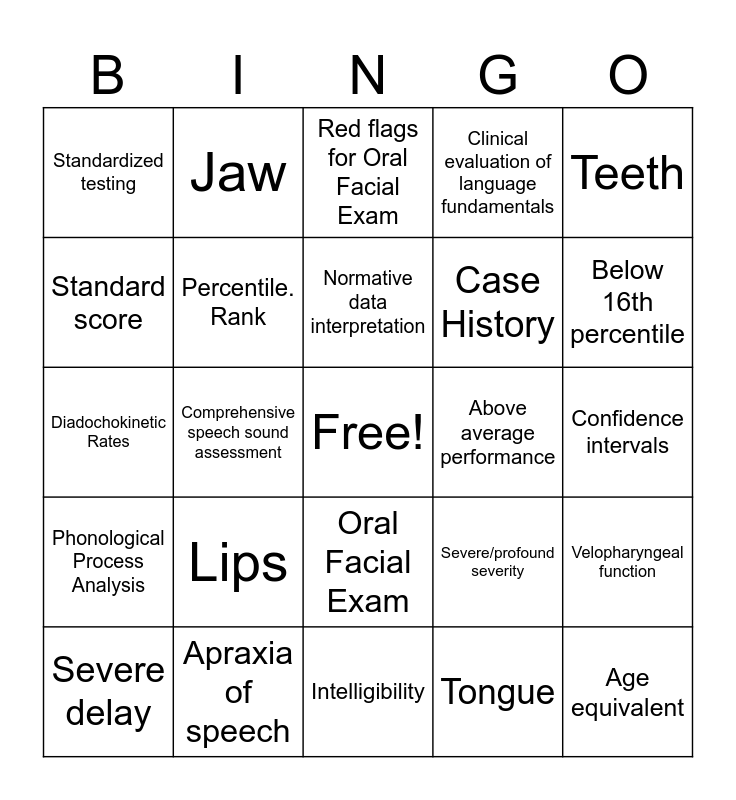 This bingo card has a free space and 24 words: Lips, Apraxia of speech, Normative data interpretation, Severe delay, Teeth, Standardized testing, Standard score, Jaw, Above average performance, Oral Facial Exam, Case History, Diadochokinetic Rates, Severe/profound severity, Velopharyngeal function, Percentile. Rank, Tongue, Confidence intervals, Red flags for Oral Facial Exam, Below 16th percentile, Comprehensive speech sound assessment, Age equivalent, Phonological Process Analysis, Clinical evaluation of language fundamentals and Intelligibility.