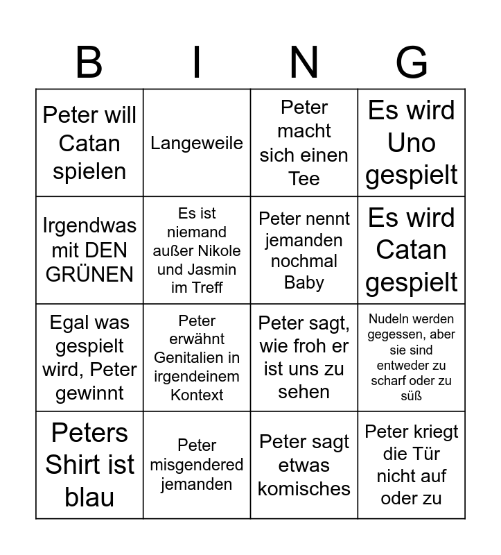 This bingo card has 17 words: Peter sagt etwas komisches, Peters Shirt ist blau, Peter macht sich einen Tee, Peter will Catan spielen, Peter erwähnt Genitalien in irgendeinem Kontext, Es wird Uno gespielt, Nudeln werden gegessen, aber sie sind entweder zu scharf oder zu süß, Peter nennt jemanden nochmal Baby, Es wird Catan gespielt, Es ist niemand außer Nikole und Jasmin im Treff, Peter misgendered jemanden, Peter sagt, wie froh er ist uns zu sehen, Irgendwas mit DEN GRÜNEN, Langeweile, Egal was gespielt wird, Peter gewinnt, Peter redet übers Wetter and Peter kriegt die Tür nicht auf oder zu.