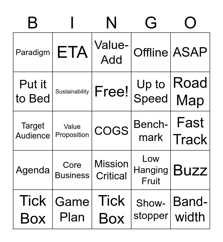 This bingo card has 1 images and 74 words: Bench-mark, Ball Park, Value-Add, Show-stopper, Outside The Box, Best Practice, Win Win, Lessons Learned, Tick Box, Game Plan, Metric, Bottom Line, Free!, Put it to Bed, Core Business, Value Proposition, Band-width, Road Map, Agenda, Target Audience, Sustainability, ETA, Offline, KPI, COGS, Fast Track, Conversion, Market Update, Go Live, Low Hanging Fruit, ASAP, Tariffs, Leading Edge, Ball Park, Add Value, Show-stopper, Outside The Box, Best Practice, Win Win, Lessons Learned, Tick Box, Game Plan, Metric, Bottom Line, Put it to Bed, Paradigm, At the end of the day, Core Business, Value Proposition, USP, Band-width, Out of the Loop, Fast Track, A-B Test, Conversion, Action, Mission Critical, Open Source, Road Map, Buzz, Up to Speed, Viral, Agenda, Brand, Bench-mark, Go Live, Sustainable, Target Audience, Low Hanging Fruit, SEO, ETA, Offline, Freight and Tariffs.