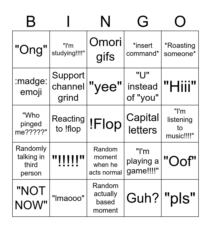 This bingo card has a free space and 24 words: "!!!!!", "lmaooo", "yee", "NOT NOW", *Roasting someone*, "Ong", :madge: emoji, "I'm studying!!!!", Capital letters, Random moment when he acts normal, "U" instead of "you", "Who pinged me?????", "I'm playing a game!!!!", "Oof", Support channel grind, Guh?, "I'm listening to music!!!!", Omori gifs, "Hiii", Reacting to !flop, "pls", Randomly talking in third person, *insert command* and Random actually based moment.