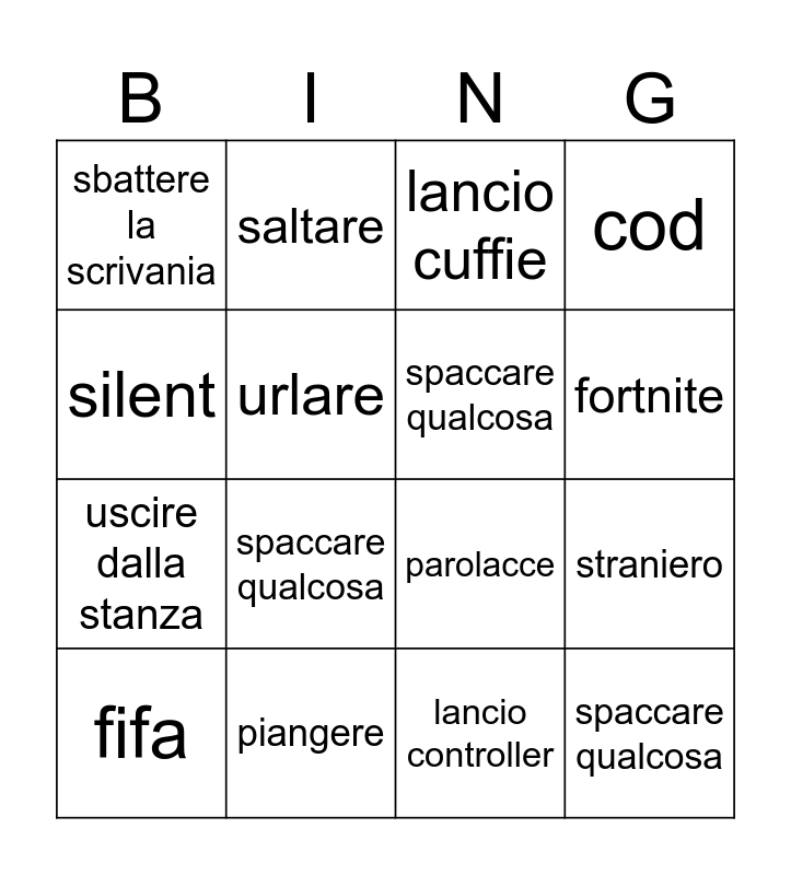 This bingo card has 16 words: fifa, piangere, lancio cuffie, cod, silent, saltare, parolacce, straniero, sbattere la scrivania, urlare, lancio controller, fortnite, uscire dalla stanza, spaccare qualcosa, spaccare qualcosa and spaccare qualcosa.
