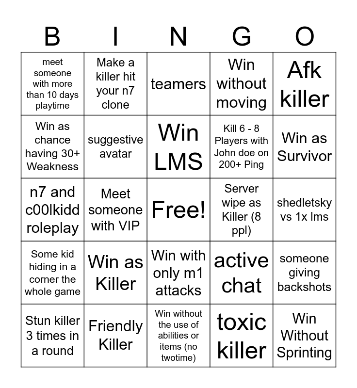 This bingo card has a free space and 24 words: Win as Killer, Friendly Killer, Win LMS, Stun killer 3 times in a round, Afk killer, meet someone with more than 10 days playtime, Win as chance having 30+ Weakness, Make a killer hit your n7 clone, Server wipe as Killer (8 ppl), Win with only m1 attacks, Kill 6 - 8 Players with John doe on 200+ Ping, n7 and c00lkidd roleplay, active chat, someone giving backshots, suggestive avatar, toxic killer, shedletsky vs 1x lms, teamers, Win as Survivor, Meet someone with VIP, Win Without Sprinting, Some kid hiding in a corner the whole game, Win without moving and Win without the use of abilities or items (no twotime).