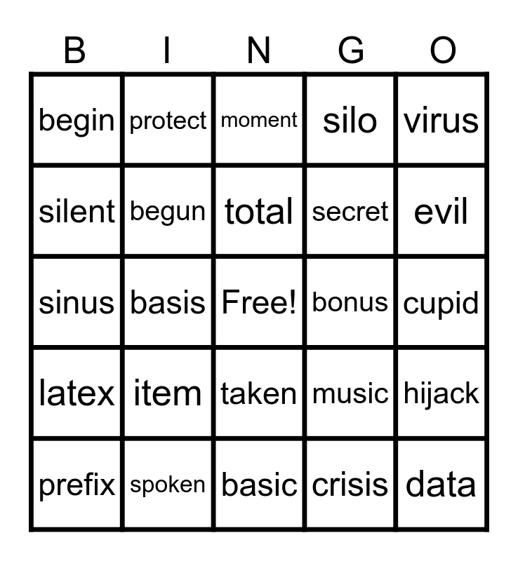 This bingo card has a free space and 31 words: basic, legal, basis, motel, begin, moment, begun, music, bonus, crisis, cupid, data, demand, even, evil, frozen, hijack, item, latex, taken, virus, result, prefix, protect, secret, silent, silo, sinus, spoken, total and vital.