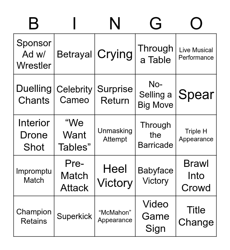 This bingo card has 33 words: Title Change, Outside Interference, “We Want Tables”, Chair Shot, Impromptu Match, Celebrity Cameo, Live Musical Performance, Champion Retains, Betrayal, Cheating, Surprise Return, Crying, Gimmick Match, On the Announce Table, Through the Barricade, Spear, Superkick, Interior Drone Shot, Pre-Match Attack, Babyface Victory, Heel Victory, Self-Important Video Package, Sponsor Ad w/ Wrestler, Triple H Appearance, “McMahon” Appearance, Unmasking Attempt, Through a Table, No-Selling a Big Move, Duelling Chants, Brawl Into Crowd, Gorilla Position, Video Game Sign and Kendo Stick Shot.