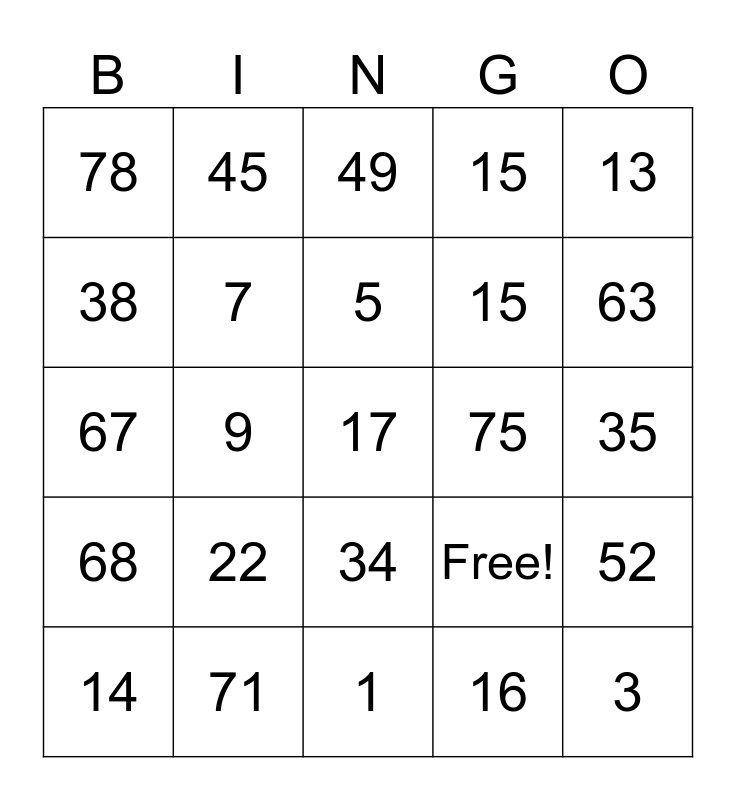 This bingo card has 25 words: 22, 1, 5, 14, 13, 78, 38, 45, 75, 34, 15, 67, Free!, 52, 7, 3, 35, 49, 63, 9, 17, 71, 68, 15 and 16.