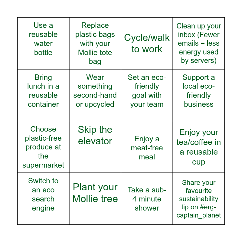 This bingo card has 16 words: Plant your Mollie tree, Enjoy your tea/coffee in a reusable cup, Cycle/walk to work, Use a reusable water bottle, Choose plastic-free produce at the supermarket, Replace plastic bags with your Mollie tote bag, Enjoy a meat-free meal, Take a sub-4 minute shower, Bring lunch in a reusable container, Wear something second-hand or upcycled, Switch to an eco search engine, Clean up your inbox (Fewer emails = less energy used by servers), Skip the elevator, Support a local eco-friendly business, Set an eco-friendly goal with your team and Share your favourite sustainability tip on #erg-captain_planet.