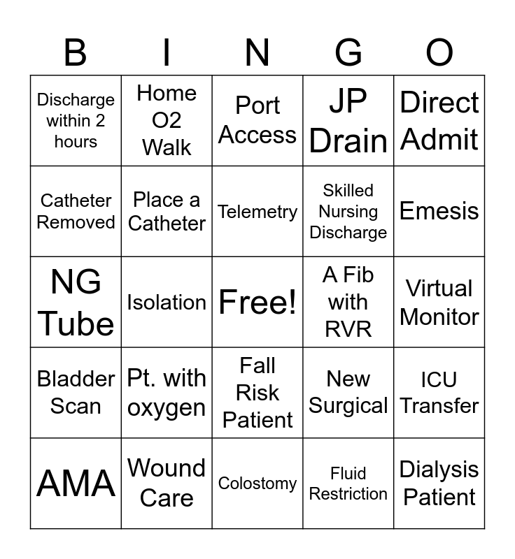This bingo card has a free space and 24 words: Pt. with oxygen, Wound Care, Telemetry, AMA, Direct Admit, Discharge within 2 hours, Catheter Removed, Home O2 Walk, A Fib with RVR, Fall Risk Patient, Skilled Nursing Discharge, NG Tube, New Surgical, ICU Transfer, Place a Catheter, Fluid Restriction, Virtual Monitor, Port Access, Emesis, Isolation, Dialysis Patient, Bladder Scan, JP Drain and Colostomy.