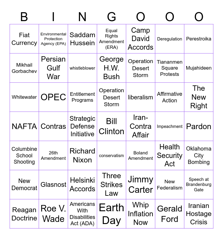 This bingo card has 49 words: New Federalism, Tiananmen Square Protests, Whip Inflation Now, Contras, Entitlement Programs, Pardon, Environmental Protection Agency (EPA), Americans With Disabilities Act (ADA), Deregulation, conservatism, Perestroika, Equal Rights Amendment (ERA), Affirmative Action, liberalism, Glasnost, Impeachment, Mikhail Gorbachev, Mujahideen, Speech at Brandenburg Gate, Camp David Accords, Operation Desert Storm, Strategic Defense Initiative, Fiat Currency, Persian Gulf War, Reagan Doctrine, whistleblower, The New Right, Roe V. Wade, Operation Desert Storm, OPEC, Iranian Hostage Crisis, Iran-Contra Affair, New Democrat, Helsinki Accords, NAFTA, Boland Amendment, Health Security Act, Oklahoma City Bombing, Whitewater, Richard Nixon, Three Strikes Law, Columbine School Shooting, Bill Clinton, Earth Day, George H.W. Bush, Saddam Hussein, Jimmy Carter, 26th Amendment and Gerald Ford.