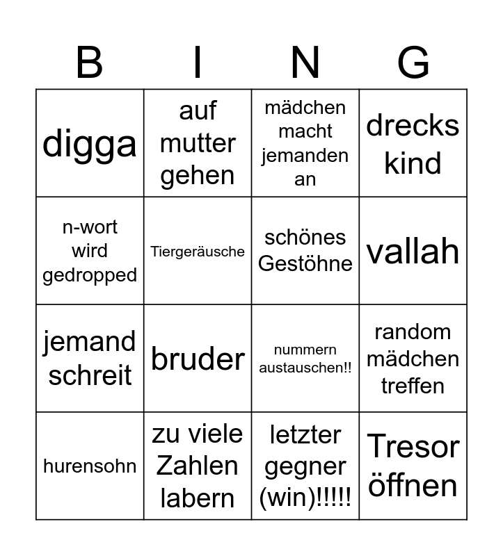 This bingo card has 16 words: zu viele Zahlen labern, random mädchen treffen, mädchen macht jemanden an, digga, jemand schreit, auf mutter gehen, nummern austauschen!!, letzter gegner (win)!!!!!, n-wort wird gedropped, Tiergeräusche, hurensohn, drecks kind, bruder, vallah, schönes Gestöhne and Tresor öffnen.