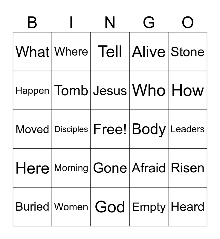 This bingo card has a free space and 24 words: Morning, Women, Jesus, Buried, Stone, What, Happen, Where, Body, Gone, Who, Moved, Afraid, Risen, Tomb, Empty, Leaders, Tell, How, Disciples, Heard, Here, Alive and God.