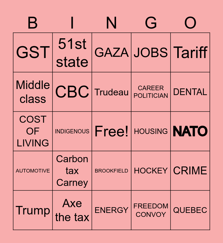 This bingo card has a free space and 24 words: Carbon tax Carney, Axe the tax, Trudeau, Trump, Tariff, GST, Middle class, 51st state, HOUSING, BROOKFIELD, CAREER POLITICIAN, COST OF LIVING, HOCKEY, CRIME, CBC, FREEDOM CONVOY, NATO, GAZA, DENTAL, INDIGENOUS, QUEBEC, AUTOMOTIVE, JOBS and ENERGY.