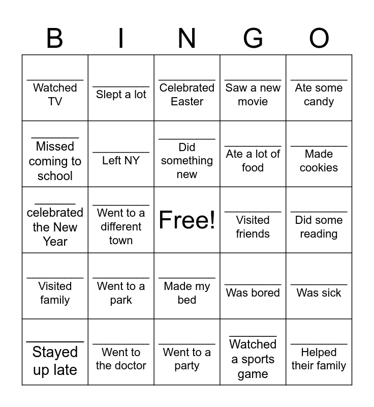 This bingo card has a free space and 24 words: _________ Went to a park, _________ Went to the doctor, _________ Did something new, _______ Stayed up late, _________ Ate some candy, _________ Watched TV, _______ Missed coming to school, _________ Slept a lot, _________ Visited friends, _________ Made my bed, _________ Ate a lot of food, ______ celebrated the New Year, _________ Was bored, _________ Was sick, _________ Left NY, _______ Watched a sports game, _________ Did some reading, _________ Celebrated Easter, _________ Made cookies, _________ Went to a different town, _________ Helped their family, _________ Visited family, _________ Saw a new movie and _________ Went to a party.