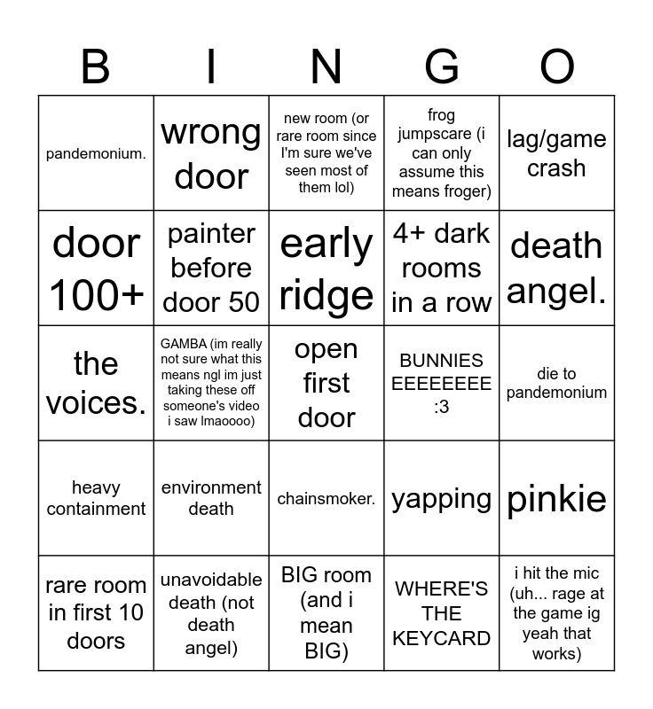 This bingo card has a free space and 24 words: environment death, unavoidable death (not death angel), early ridge, rare room in first 10 doors, lag/game crash, pandemonium., door 100+, wrong door, BUNNIES EEEEEEEE :3, chainsmoker., 4+ dark rooms in a row, the voices., yapping, pinkie, painter before door 50, WHERE'S THE KEYCARD, die to pandemonium, new room (or rare room since I'm sure we've seen most of them lol), death angel., GAMBA (im really not sure what this means ngl im just taking these off someone's video i saw lmaoooo), i hit the mic (uh... rage at the game ig yeah that works), heavy containment, frog jumpscare (i can only assume this means froger) and BIG room (and i mean BIG).