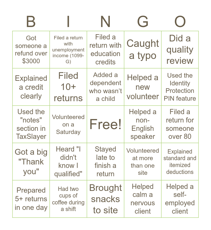 This bingo card has a free space and 29 words: Prepared 5+ returns in one day, Helped a first-time filer, Volunteered on a Saturday, Used the 1040 form, Got someone a refund over $3000, Filed a return with education credits, Filed 10+ returns, Heard "I didn't know I qualified", Helped a non-English speaker, Had two cups of coffee during a shift, Filed a return for someone over 80, Helped a self-employed client, Brought snacks to site, Helped calm a nervous client, Used the Identity Protection PIN feature, Made a client smile, Stayed late to finish a return, Got a big "Thank you", Did a quality review, Used the "notes" section in TaxSlayer, Volunteered at more than one site, Used publication 4012 to solve a situation, Helped a new volunteer, Explained a credit clearly, Caught a typo, Filed a return with unemployment income (1099-G), Explained standard and itemized deductions, Added a dependent who wasn’t a child and Identified an incorrect filing status.