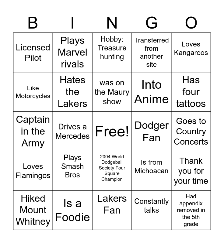 This bingo card has a free space and 44 words: Has been to 3 FIFA world cups, Had appendix removed in the 5th grade, Originally from New Orleans, Hiked Mount Whitney, Won a refrigerator on the Price is Right, Constantly talks, Hobby: Treasure hunting, Does not know how to swim, Loves Kangaroos, Is a Foodie, Transferred from another site, Dodger Fan, 2004 World Dodgeball Society Four Square Champion, Plays Smash Bros, Completed 5k run, Lakers Fan, Lived in Japan for 1 year, Captain in the Army, Rescues Turtles, Has four tattoos, Plays Marvel rivals, Has visited 15 countries, Plays Piano, Licensed Pilot, Built a gaming controller out of wood, Goes to Country Concerts, Goes to Coachella, Is of Korean descent, Is from Michoacan, Loves Flamingos, Quotes Boondocks, Thank you for your time, Two Ams that went to Academy together, Gym Rat, Drives a Mercedes, Has electric bike, was PA before AM, was Driver Trainer before AM, was on the Maury show, Like Motorcycles, Into Anime, Plays Marvel Rivals, Hates the Lakers and Thinks Endgame is a terrible movie.