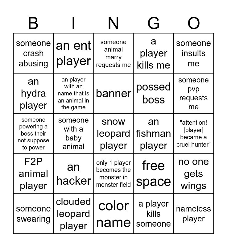 This bingo card has 25 words: an hacker, color name, banner, someone swearing, someone insults me, someone crash abusing, an hydra player, an ent player, an fishman player, only 1 player becomes the monster in monster field, possed boss, someone powering a boss their not suppose to power, free space, no one gets wings, an player with an name that is an animal in the game, nameless player, "attention! [player] became a cruel hunter", someone animal marry requests me, someone pvp requests me, someone with a baby animal, snow leopard player, clouded leopard player, F2P animal player, a player kills me and a player kills someone.