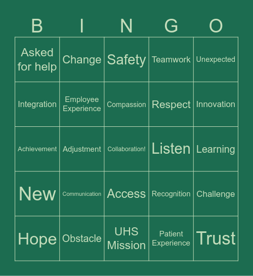 This bingo card has a free space and 24 words: Communication, Obstacle, Compassion, Hope, Unexpected, Asked for help, Integration, Change, Listen, Access, Respect, Achievement, Recognition, Challenge, Employee Experience, Patient Experience, Learning, Safety, Innovation, Adjustment, Trust, New, Teamwork and UHS Mission.