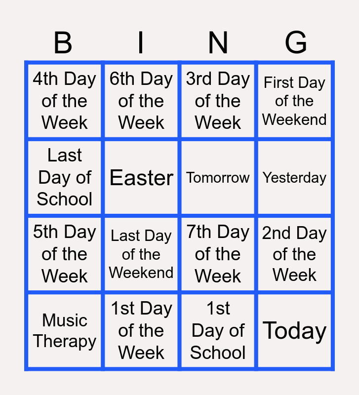 This bingo card has 16 words: 1st Day of the Week, 2nd Day of the Week, 3rd Day of the Week, 4th Day of the Week, 5th Day of the Week, 6th Day of the Week, 7th Day of the Week, 1st Day of School, Last Day of School, Easter, Music Therapy, First Day of the Weekend, Last Day of the Weekend, Yesterday, Tomorrow and Today.