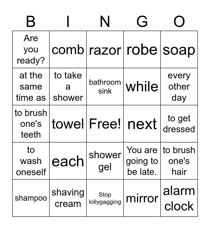 This bingo card has a free space and 39 words: bathtub, to take a bath, a shower, to take a shower, shampoo, shower gel, bathroom sink, faucet, soap, to wash oneself, towel, robe, alarm clock, to get dressed, next, each, before, Are you ready?, Hurry up!, You are going to be late., at the same time as, Stop lollygagging, while, every other day, to wake up, to get up, lip stick, to do one's hair, blow dryer, comb, toothbrush, toothpaste, razor, shaving cream, mirror, to comb one's hair, to brush one's hair, to brush one's teeth and makeup.