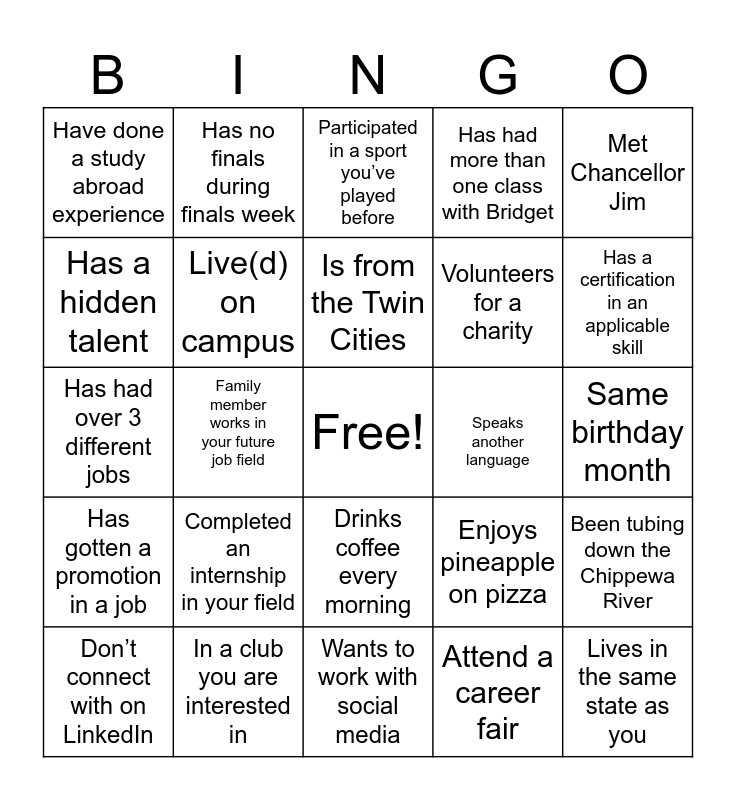 This bingo card has a free space and 29 words: Don’t connect with on LinkedIn, Wearing the same color as you, Family member works in your future job field, Is/was in your same major, Have done a study abroad experience, Participated in a sport you’ve played before, Live(d) on campus, Completed an internship in your field, Speaks another language, In a club you are interested in, Same birthday month, Lives in the same state as you, Wants to work with social media, Attend a career fair, Has a certification in an applicable skill, Looking for an internship/job, Drinks coffee every morning, Has gotten a promotion in a job, Met Chancellor Jim, Has had over 3 different jobs, Enjoys pineapple on pizza, Drinks coffee every morning, Volunteers for a charity, Has a hidden talent, Has had more than one class with Bridget, Has no finals during finals week, Been tubing down the Chippewa River, Is from the Twin Cities and Is from Milwaulke.