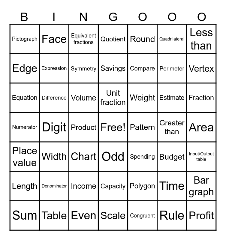 This bingo card has a free space and 48 words: Place value, Digit, Even, Odd, Compare, Greater than, Less than, Sum, Difference, Product, Quotient, Round, Estimate, Fraction, Numerator, Denominator, Equivalent fractions, Unit fraction, Polygon, Quadrilateral, Vertex, Edge, Face, Symmetry, Congruent, Perimeter, Area, Length, Width, Volume, Capacity, Weight, Time, Bar graph, Pictograph, Table, Chart, Scale, Pattern, Rule, Input/Output table, Equation, Expression, Income, Savings, Spending, Budget and Profit.