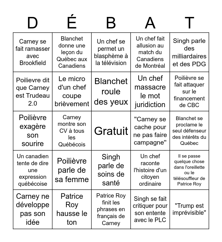 This bingo card has a free space and 24 words: Poilièvre parle de sa femme, Patrice Roy hausse le ton, Blanchet roule des yeux, Carney ne développe pas son idée, Singh parle des milliardaires et des PDG, Carney se fait ramasser avec Brookfield, Poilievre dit que Carney est Trudeau 2.0, Blanchet donne une leçon du Québec aux Canadiens, ''Carney se cache pour ne pas faire campagne'', Singh parle de soins de santé, Un chef massacre le mot juridiction, Poilièvre exagère son sourire, Un chef raconte l'histoire d'un citoyen ordinaire, Il se passe quelque chose dans l'oreillette ou le télésouffleur de Patrice Roy, Le micro d'un chef coupe brièvement, Singh se fait critiquer pour son entente avec le PLC, Blanchet se proclame le seul défenseur des intérêts du Québec, Un chef se permet un blasphème à la télévision, Poilièvre se fait attaquer sur le financement de CBC, Carney montre son CV à tous les Québécois, ''Trump est imprévisible'', Un canadien tente de dire une expression québécoise, Un chef fait allusion au match du Canadiens de Montréal and Patrice Roy finit les phrases en français de Carney.