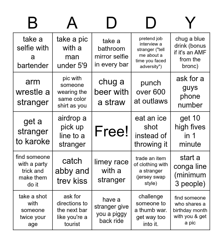 This bingo card has a free space and 25 words: catch abby and trev kiss, have a stranger give you a piggy back ride, chug a beer with a straw, take a shot with someone twice your age, chug a blue drink (bonus if it's an AMF from the bronc), take a selfie with a bartender, arm wrestle a stranger, take a pic with a man under 5'9, eat an ice shot instead of throwing it, limey race with a stranger, punch over 600 at outlaws, get a stranger to karoke, trade an item of clothing with a stranger (jersey swap style), start a conga line (minimum 3 people), pic with someone wearing the same color shirt as you, get a pic behind the bar, get 10 high fives in 1 minute, take a bathroom mirror selfie in every bar, ask for a guys phone number, airdrop a pick up line to a stranger, find someone who shares a birthday month with you & get a pic, ask for directions to the next bar like you're a tourist, find someone with a party trick and make them do it, pretend job interview a stranger ("tell me about a time you faced adversity") and challenge someone to a thumb war. get way too into it..