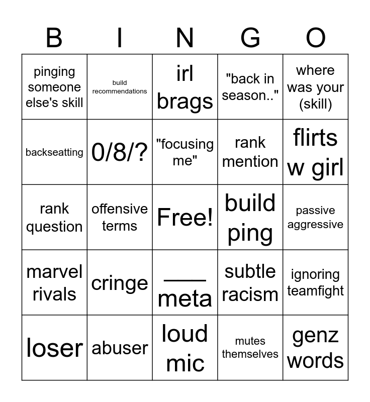 This bingo card has a free space and 24 words: cringe, abuser, "focusing me", loser, where was your (skill), pinging someone else's skill, backseatting, build recommendations, build ping, ___ meta, rank mention, rank question, subtle racism, ignoring teamfight, 0/8/?, mutes themselves, passive aggressive, irl brags, flirts w girl, offensive terms, genz words, marvel rivals, "back in season.." and loud mic.