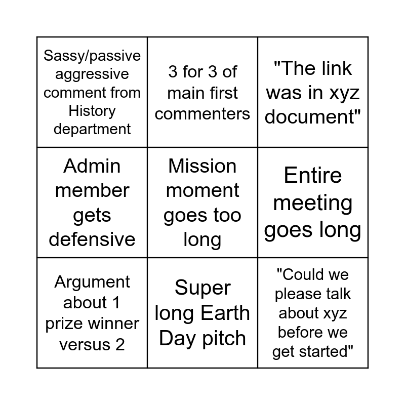 This bingo card has a free space and 8 words: Entire meeting goes long, "The link was in xyz document", 3 for 3 of main first commenters, Argument about 1 prize winner versus 2, Sassy/passive aggressive comment from History department, "Could we please talk about xyz before we get started", Admin member gets defensive and Super long Earth Day pitch.