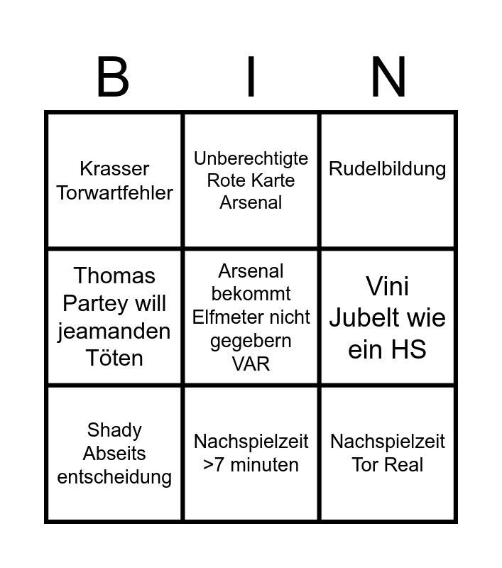 This bingo card has a free space and 8 words: Vini Jubelt wie ein HS, Rudelbildung, Unberechtigte Rote Karte Arsenal, Shady Abseits entscheidung, Krasser Torwartfehler, Nachspielzeit Tor Real, Thomas Partey will jeamanden Töten and Nachspielzeit >7 minuten.