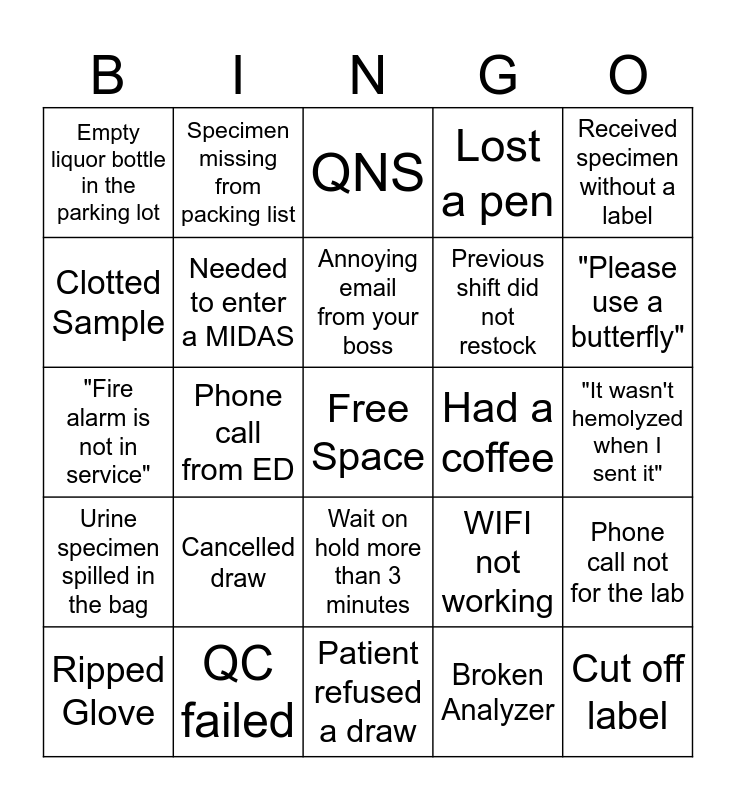 This bingo card has a free space and 24 words: Cancelled draw, QC failed, Annoying email from your boss, Ripped Glove, Received specimen without a label, Empty liquor bottle in the parking lot, Clotted Sample, Specimen missing from packing list, Had a coffee, Wait on hold more than 3 minutes, Previous shift did not restock, "Fire alarm is not in service", WIFI not working, Phone call not for the lab, Needed to enter a MIDAS, Broken Analyzer, "It wasn't hemolyzed when I sent it", QNS, "Please use a butterfly", Phone call from ED, Cut off label, Urine specimen spilled in the bag, Lost a pen and Patient refused a draw.