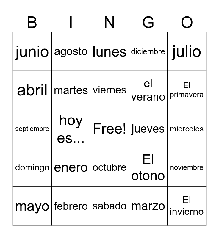 This bingo card has a free space and 24 words: enero, febrero, viernes, mayo, julio, junio, abril, agosto, jueves, octubre, el verano, septiembre, El otono, noviembre, martes, marzo, miercoles, lunes, El primavera, hoy es..., El invierno, domingo, diciembre and sabado.
