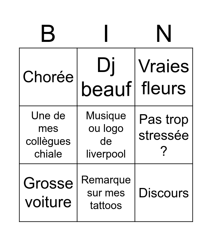 This bingo card has a free space and 8 words: Pas trop stressée ?, Vraies fleurs, Dj beauf, Grosse voiture, Chorée, Discours, Une de mes collègues chiale and Remarque sur mes tattoos.
