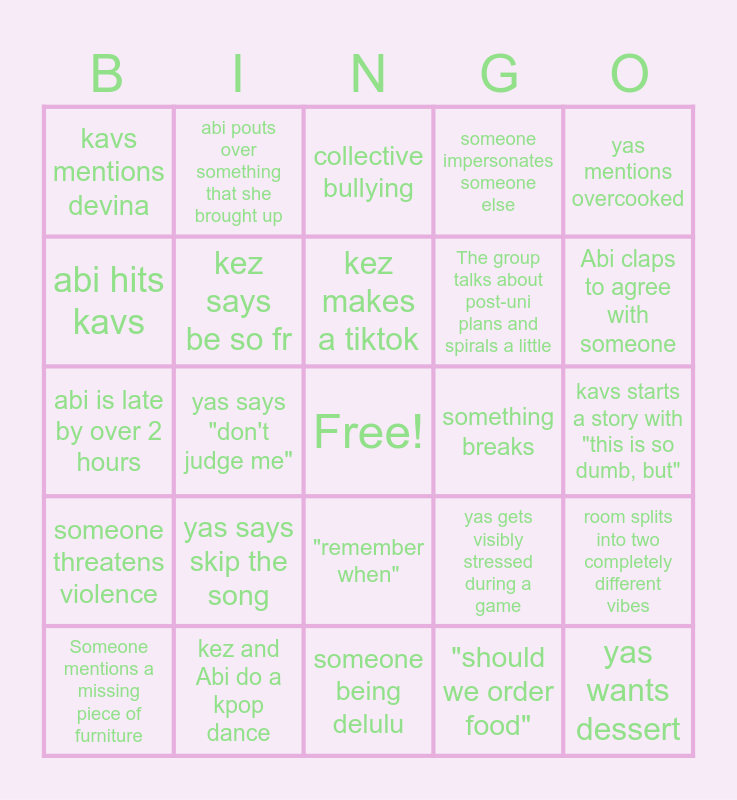 This bingo card has a free space and 24 words: yas says skip the song, kez and Abi do a kpop dance, kez makes a tiktok, Someone mentions a missing piece of furniture, yas mentions overcooked, kavs mentions devina, abi hits kavs, abi pouts over something that she brought up, something breaks, "remember when", The group talks about post-uni plans and spirals a little, abi is late by over 2 hours, yas gets visibly stressed during a game, room splits into two completely different vibes, kez says be so fr, "should we order food", kavs starts a story with "this is so dumb, but", collective bullying, Abi claps to agree with someone, yas says "don't judge me", yas wants dessert, someone threatens violence, someone impersonates someone else and someone being delulu.