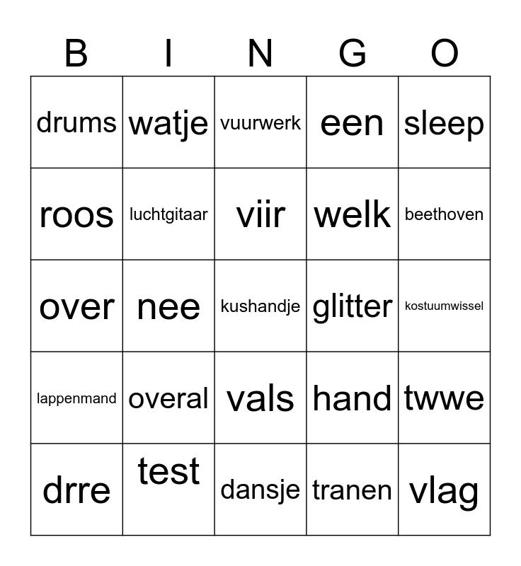 This bingo card has 30 words: test, watte, nee, je, drums, vuurwerk, luchtgitaar, vals, glitter, dansje, kostuumwissel, kushandje, tranen, vlag, beethoven, hond, hand, lappenmand, overal, sleep, over, water, watje, welk, roos, een, twwe, drre, viir and rest.