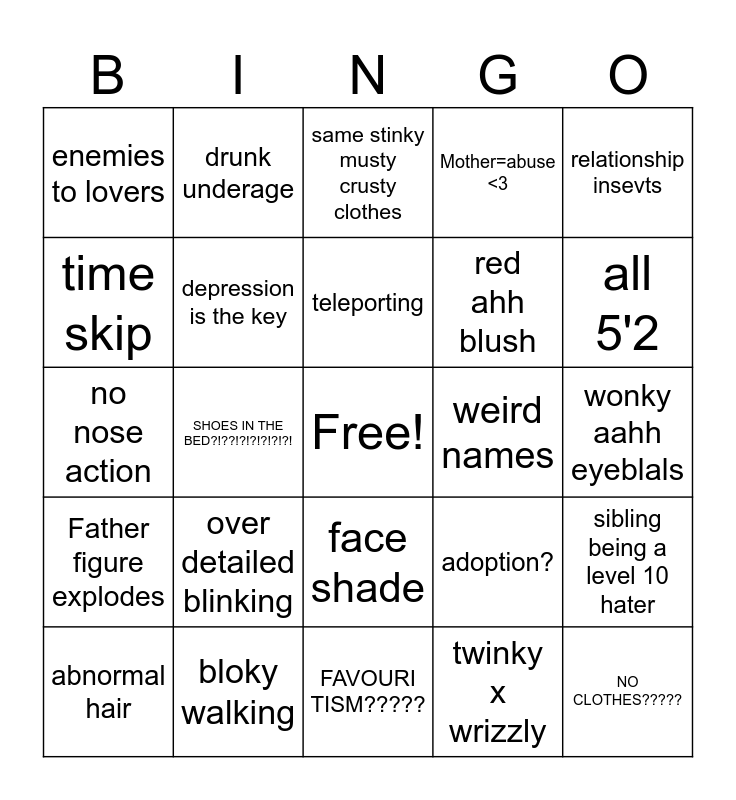 This bingo card has a free space and 24 words: over detailed blinking, bloky walking, teleporting, abnormal hair, relationship insevts, enemies to lovers, time skip, drunk underage, weird names, face shade, red ahh blush, no nose action, adoption?, sibling being a level 10 hater, depression is the key, twinky x wrizzly, wonky aahh eyeblals, same stinky musty crusty clothes, all 5'2, SHOES IN THE BED?!??!?!?!?!?!?!, NO CLOTHES?????, Father figure explodes, Mother=abuse <3 and FAVOURI TISM?????.
