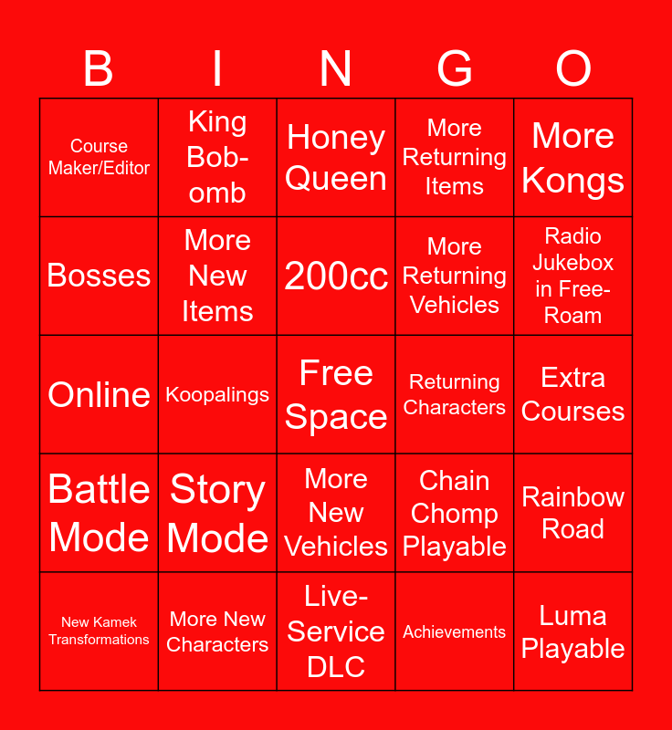 This bingo card has a free space and 24 words: Story Mode, More New Characters, 200cc, New Kamek Transformations, More Kongs, Course Maker/Editor, Bosses, King Bob-omb, Returning Characters, More New Vehicles, More Returning Vehicles, Online, Chain Chomp Playable, Rainbow Road, More New Items, Achievements, Extra Courses, Honey Queen, Radio Jukebox in Free-Roam, Koopalings, Luma Playable, Battle Mode, More Returning Items and Live-Service DLC.