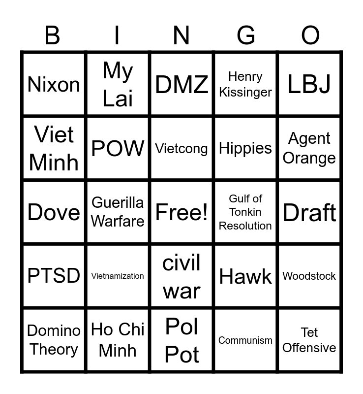 This bingo card has a free space and 24 words: Vietnamization, Ho Chi Minh, Vietcong, Domino Theory, LBJ, Nixon, Viet Minh, My Lai, Gulf of Tonkin Resolution, civil war, Hippies, Dove, Hawk, Woodstock, POW, Communism, Draft, DMZ, Agent Orange, Guerilla Warfare, Tet Offensive, PTSD, Henry Kissinger and Pol Pot.