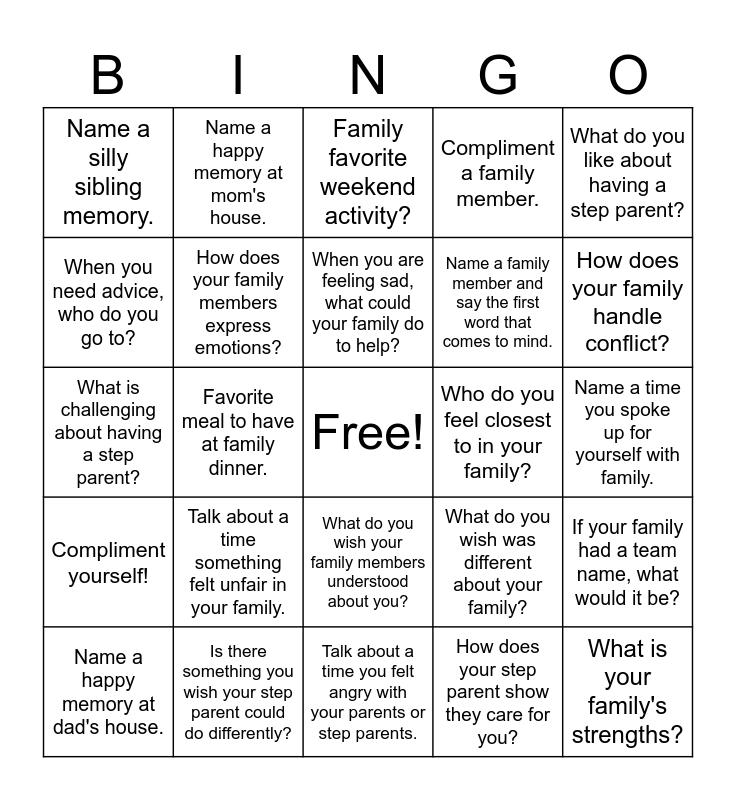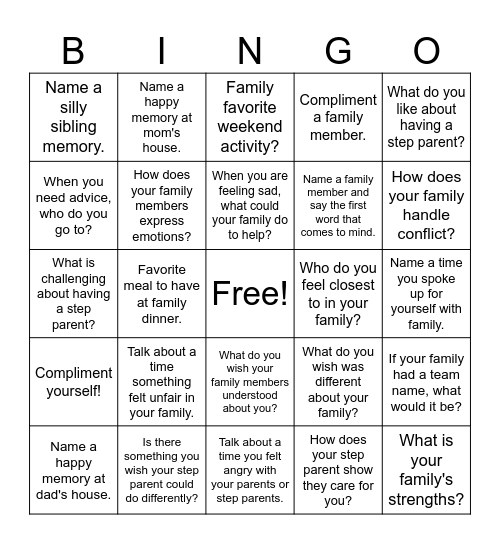 This bingo card has a free space and 24 words: Talk about a time something felt unfair in your family., Is there something you wish your step parent could do differently?, When you are feeling sad, what could your family do to help?, Name a happy memory at dad's house., What do you like about having a step parent?, Name a silly sibling memory., When you need advice, who do you go to?, Name a happy memory at mom's house., Who do you feel closest to in your family?, What do you wish your family members understood about you?, Name a family member and say the first word that comes to mind., What is challenging about having a step parent?, What do you wish was different about your family?, If your family had a team name, what would it be?, How does your family members express emotions?, How does your step parent show they care for you?, Name a time you spoke up for yourself with family., Family favorite weekend activity?, How does your family handle conflict?, Favorite meal to have at family dinner., What is your family's strengths?, Compliment yourself!, Compliment a family member. and Talk about a time you felt angry with your parents or step parents..