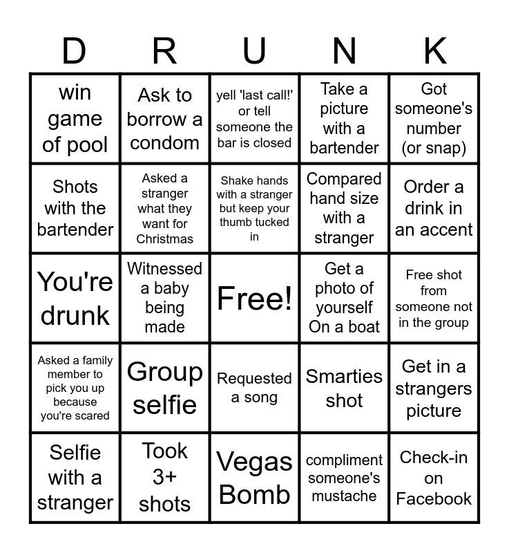 This bingo card has a free space and 29 words: Selfie with a stranger, Drank a full drink while holding hands with someone, Witnessed a baby being made, witnessed a party foul (drink spill or fight), win game of pool, yell 'last call!' or tell someone the bar is closed, Asked a stranger what they want for Christmas, Group selfie, Get a photo of yourself On a boat, Took 3+ shots, Free shot from someone not in the group, Check-in on Facebook, Vegas Bomb, compliment someone's mustache, Order a drink in an accent, See someone in lingerie, Requested a song, Asked a family member to pick you up because you're scared, Got someone's number (or snap), You're drunk, Smarties shot, talked to someone on someone else's phone, Compared hand size with a stranger, Shots with the bartender, Take a picture with a bartender, Ask to borrow a condom, Get in a strangers picture, Shake hands with a stranger but keep your thumb tucked in and Make it to the blind pig.